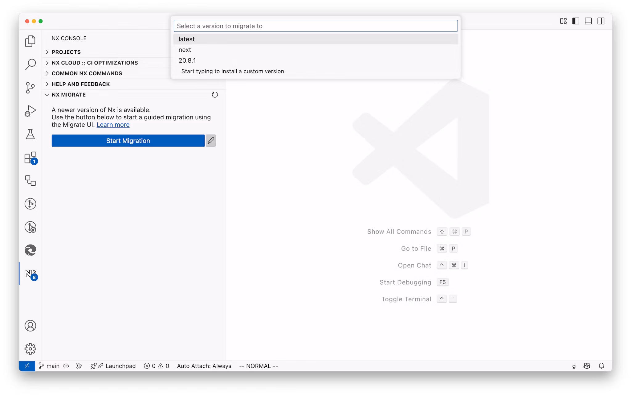When an update to Nx is available, a badge will appear on the Nx Console icon in your Activity Bar. Bring up the Nx Console view (Hint: type in > Show Nx Console in the Command Palette), and you'll see a Nx Migrate section in the sidebar. Clicking Start Migration starts the migration process.